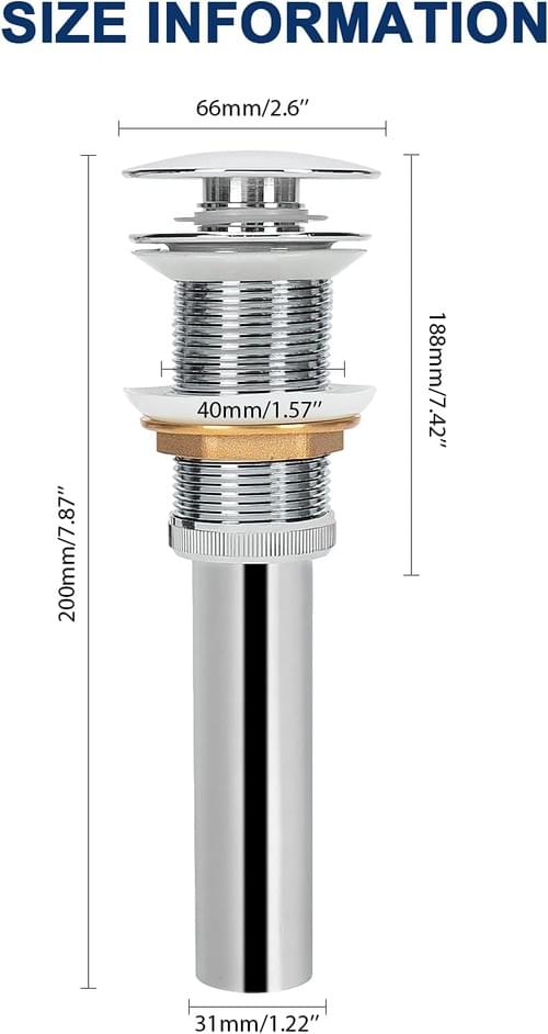 PREMIUM MATERIAL: The pop up drain stopper is constructed of solid brass, which has strong wear resistance. And the tailpiece is made of 304 stainless steel with rustproof. Chrome finish surface treatment with a smooth surface will not fade, built to resist daily scratches and tarnishing.