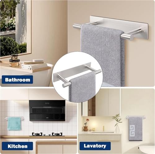 WIDELY APPLICATION: Self-adhesive towel rack is 9 inches long and 2.36 inches from the wall, suitable for bathroom, kitchen, RV hanging hand towels, bath towels, dish towel, etc