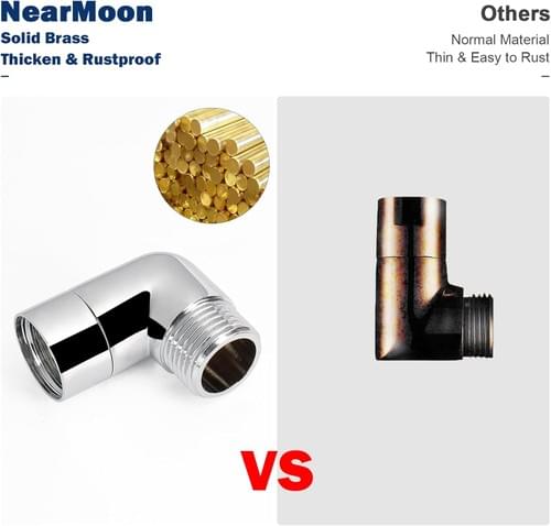 QUALITY: NearMoon shower head elbow adapter is made of solid BRASS, which has high heat-resistance and pressure-resistance. Multi-layer chrome finish, build to resist daily scratches. It can serve many years without leakage.