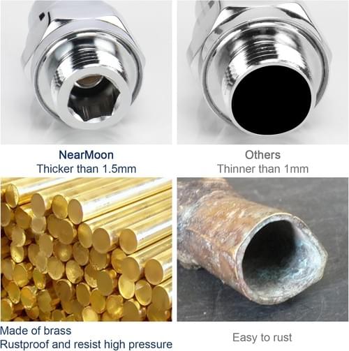 "SOLID BRASS: NearMoon shower head swivel ball adapter is made of solid BRASS, which has high heat-resistance and pressure-resistance. Multi-layer chrome finish, build to resist daily scratches. It can serve many years without leakage.